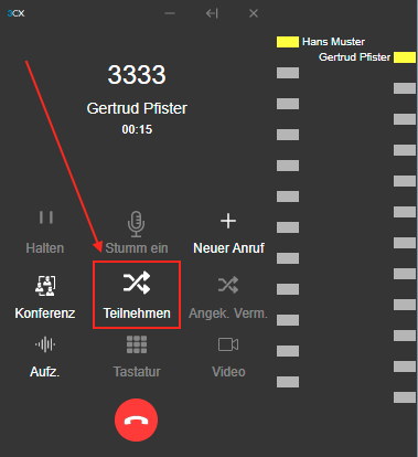 Die gewählte Rufnummer wird angerufen. Um das Gespräch schlussendlich zu vermitteln, klicken Sie auf Teilnehmen