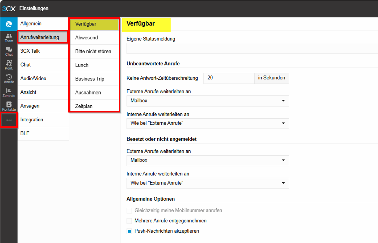 Hier kann für jeden Status geregelt werden, wohin der Anruf weitergeleitet wird.