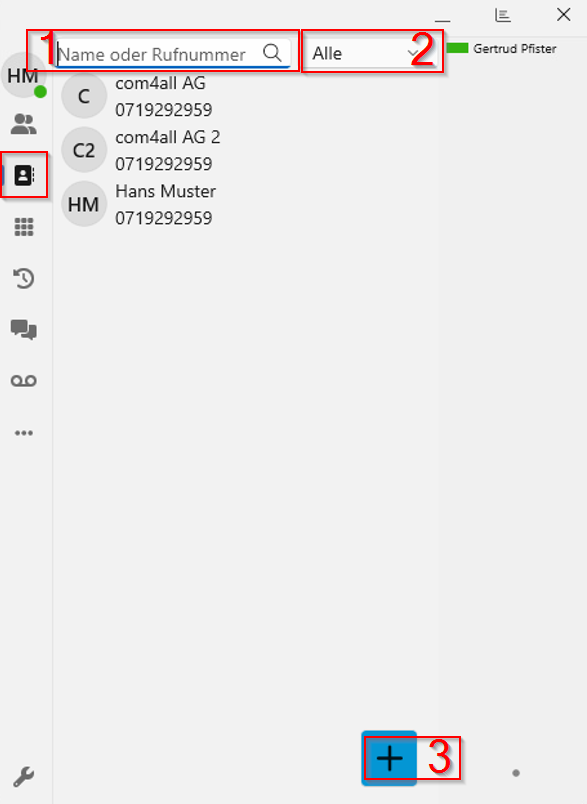 Über die «Auswahlbox» (2) können Sie eine Filterung der verschiedenen Kontaktverzeichnisse vornehmen. Jeder Benutzer hat ein privates Kontaktverzeichnis. Das Firmenverzeichnis ist von allen Benutzern einsehbar.