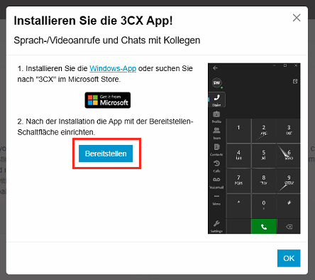 Nach der Anmeldung öffnet sich ein weiterer Dialog bei dem Sie auf "Bereitstellen" klicken können.