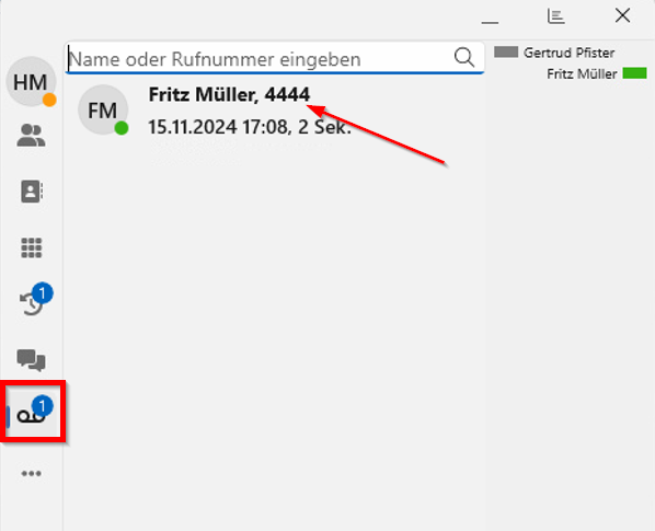 Sobald Sie eine neue Nachricht in Ihrer Mailbox erhalten haben wird diese unten angezeigt. Durch ein Klick auf den Absender können Sie sich die Nachricht anhören