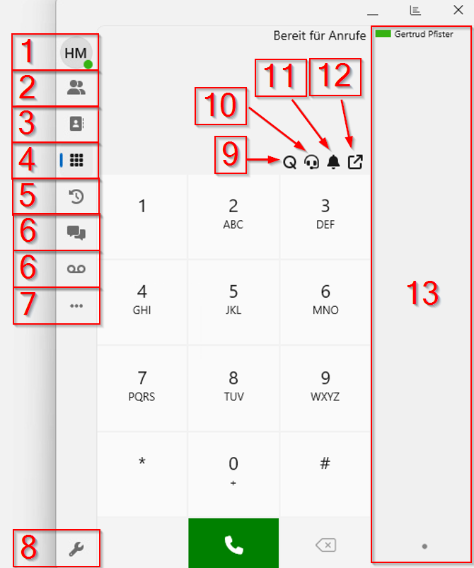 11. Anzeige des verwendeten Geräts. Info: Bitte beachten Sie, dass Sie das richtige Gerät verwenden. Wenn Sie über ein Tischtelefon telefonieren, muss bei dieser Anzeige ein Tischtelefon angezeigt werden