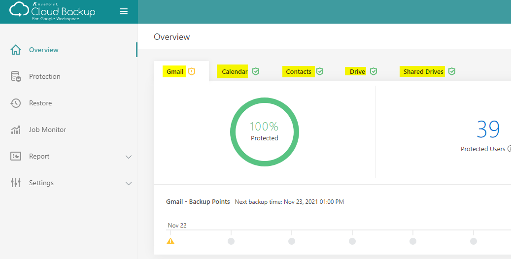 Unter "Job Monitor" ist die Timeline der vergangenen Backup-Jobs und Wiederherstellung/Export-Jobs allgemein ersichtlich