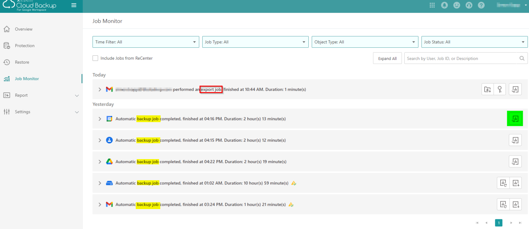 Unter "Job Monitor" ist die Timeline der vergangenen Backup-Jobs und Wiederherstellung/Export-Jobs allgemein ersichtlich