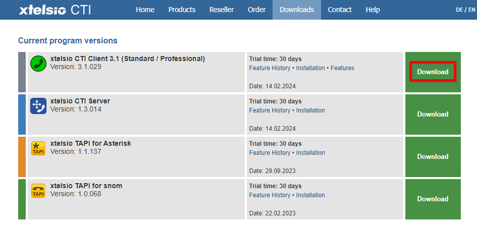 Download von xtelsio CTI Client 3.1 (Std / Prof) als zip-File unter https://www.xtelsio.com/en/download.htm