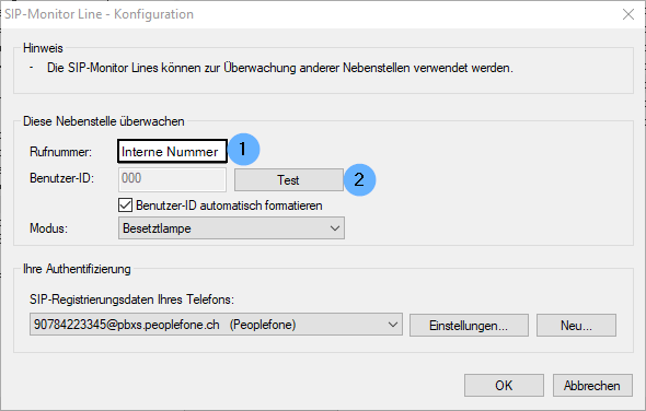 Als nächstes muss die interne Rufnummer eingegeben werden. Per Klick auf "Test" kann geprüft werden ob die Verbindung funktioniert