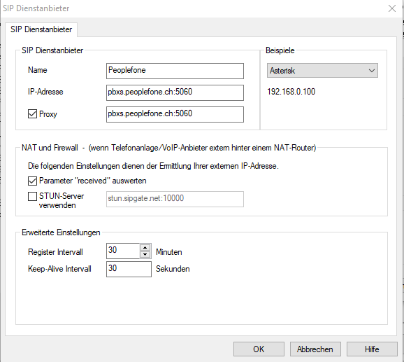 Wenn noch keine SIP-Registrierungsdaten eingetragen Sind, müssen diese zuvor eingetragen werden. Hier finden Sie die Angaben zum Provider Peoplefone: