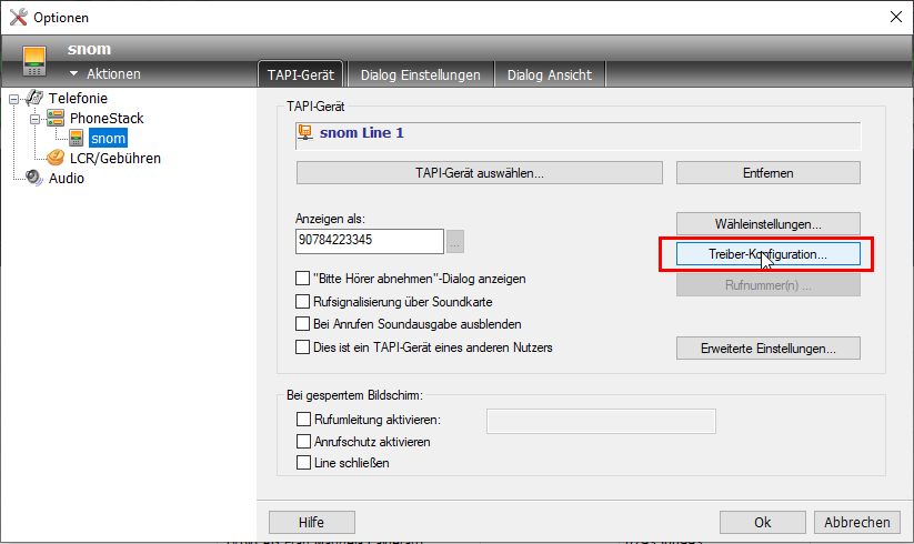 1. Im Xtelsio unter Optionen --> snom (Tapi Gerät) --> die Treiber-Konfiguration öffnen: