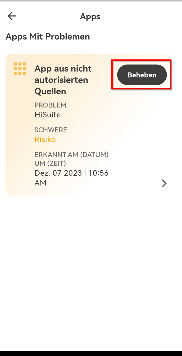 Die Sicherheitsanalyse zeigt Ihnen eine Übersicht mit riskanten Apps. Klicken Sie auf "Beheben" und Sie erhalten Informationen zu diesem potentiellen Sicherheitsproblem und wie dieses behoben werden kann