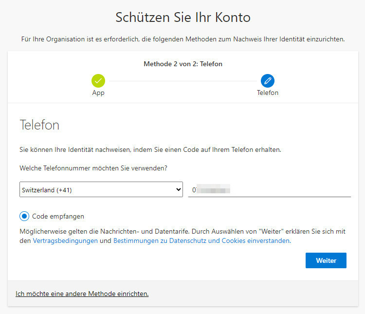 Anschliessend werden Sie dazu aufgefordert eine weitere Methode einzurichten.