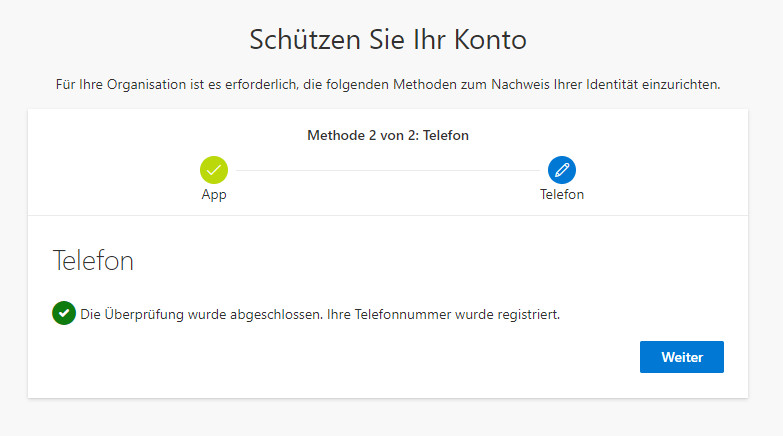 Die mehrstufige Authentifizierung ist eingerichtet. Die von Ihnen gewählten Verifizierungs-Methoden stehen Ihnen nun bei jeder Anmeldung zu Verfügung.