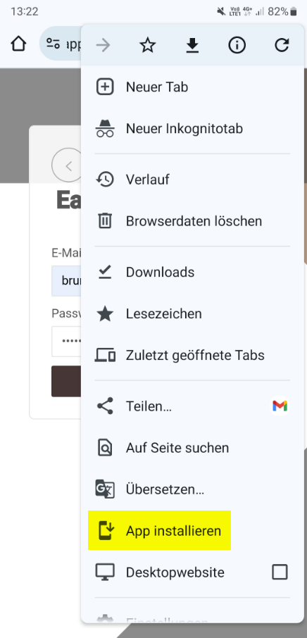 Falls Sie eingeloggt sind, oder das Installation Pop-up-Fenster verpasst haben, kann dies nachträglich oben rechts mit den drei Punkten öffnen und Installiert werden.