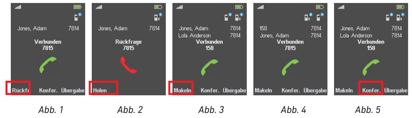 · Wenn Sie mit beiden Teilnehmern verbunden sind drücken Sie die Taste "Konfer" (Abb 5)