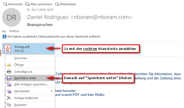 3 Speichern Sie den Anhang, hier die pdf-Datei Antrag.pdf, auf Ihrem Rechner. Dazu markieren Sie den Anhang nur 1 Mal mit der rechten Maustaste (ACHTUNG: Den Anhang NIEMALS doppelklicken ansonsten öffnen Sie die Datei was wir ja unbedingt verhindern wollen) und wählen im Kontextmenü «Speichern unter» an: