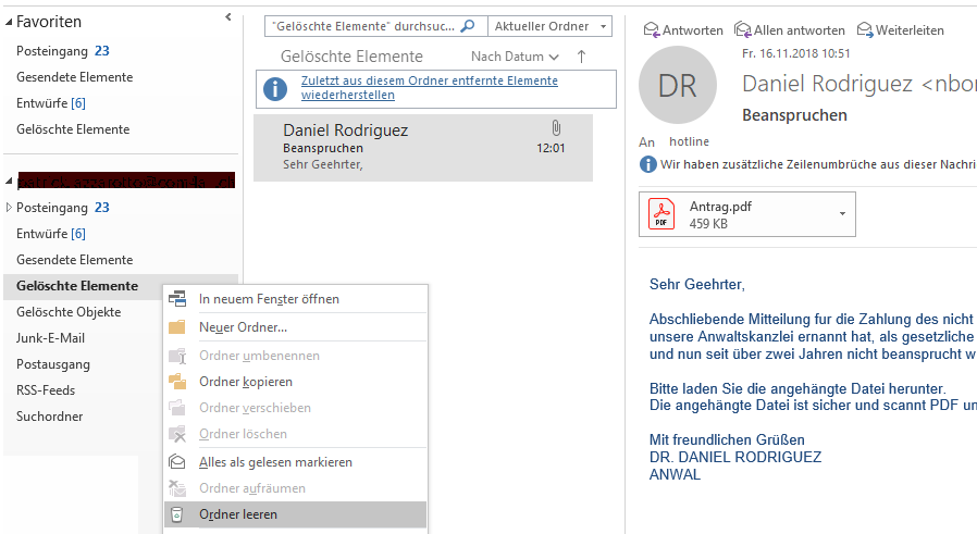 Klicken Sie mit der rechten Maustaste auf «Gelöschte Elemente» und dann auf «Ordner leeren»