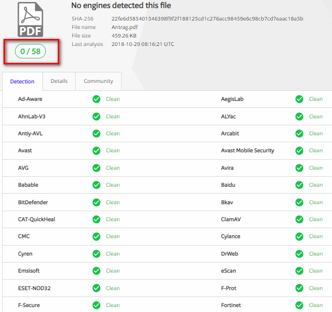Die Datei wird nun von mehr als 50 verschiedenen Antiviren-Scannern überprüft. Dabei gibt es zwei mögliche Resultate: