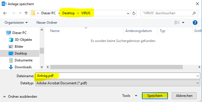 und als Speicherort wählen Sie den Ordner «VIRUS» den Sie unter Punkt 1 erstellt haben und klicken auf «Speichern»