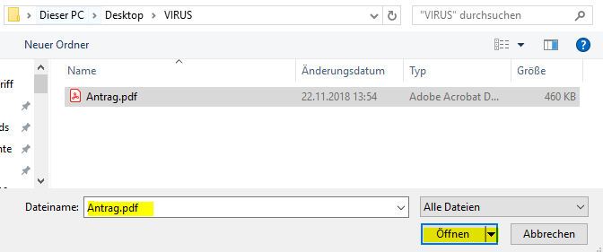 und markieren im Ordner «VIRUS» die Datei «Antrag.pdf» aus und bestätigen durch «Öffnen». Der Ausdruck «Öffnen» im unteren Bild bezieht sich nur darauf, dass die markierte Datei zum Upload auf virustotal.com ausgewählt wird. Damit wird die Datei aber nicht ausgeführt – was wir ja auch nicht wollen