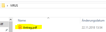 Wenn Sie den Ordner «VIRUS» öffnen dann sehen Sie die von Ihnen abgespeicherte Datei. Auch hier gilt wieder dass Sie diese Datei unter keinen Umständen öffnen!