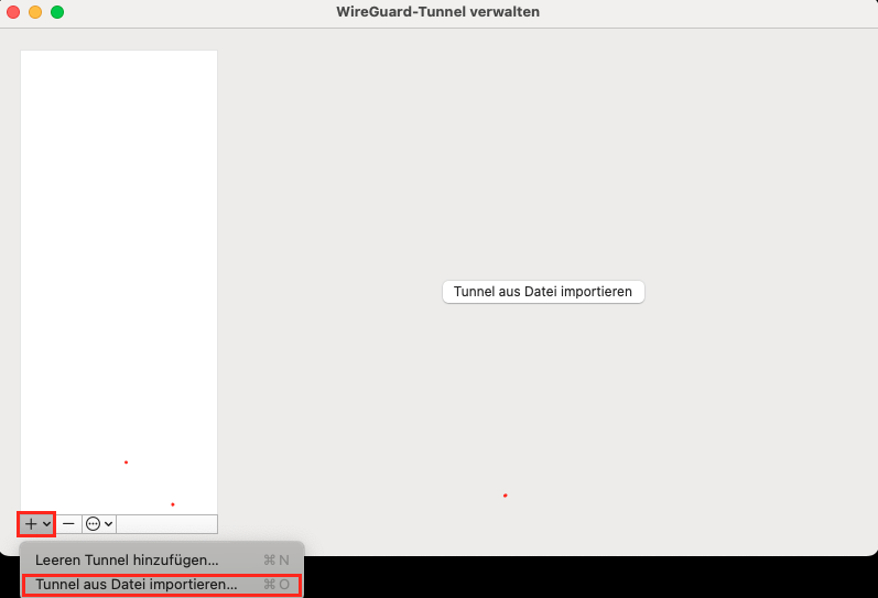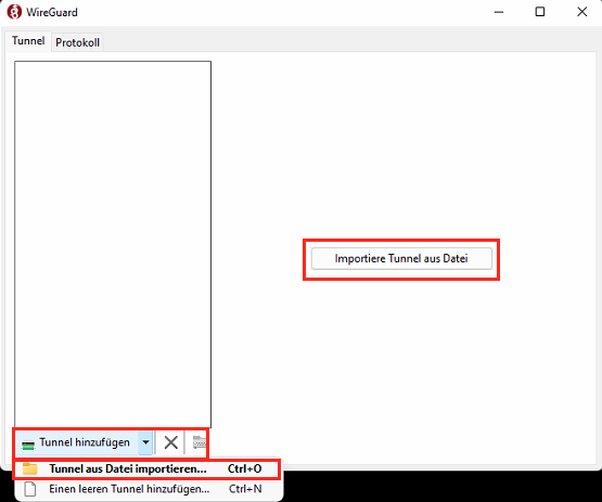 Nach dem Start der Applikation können Sie das Konfigurationsfile einlesen. Klicken Sie hierzu auf "Tunnel hinzufügen". Wählen Sie danach "Tunnel aus Datei importieren" und öffnen Sie die erhaltene Konfigurationsdatei.